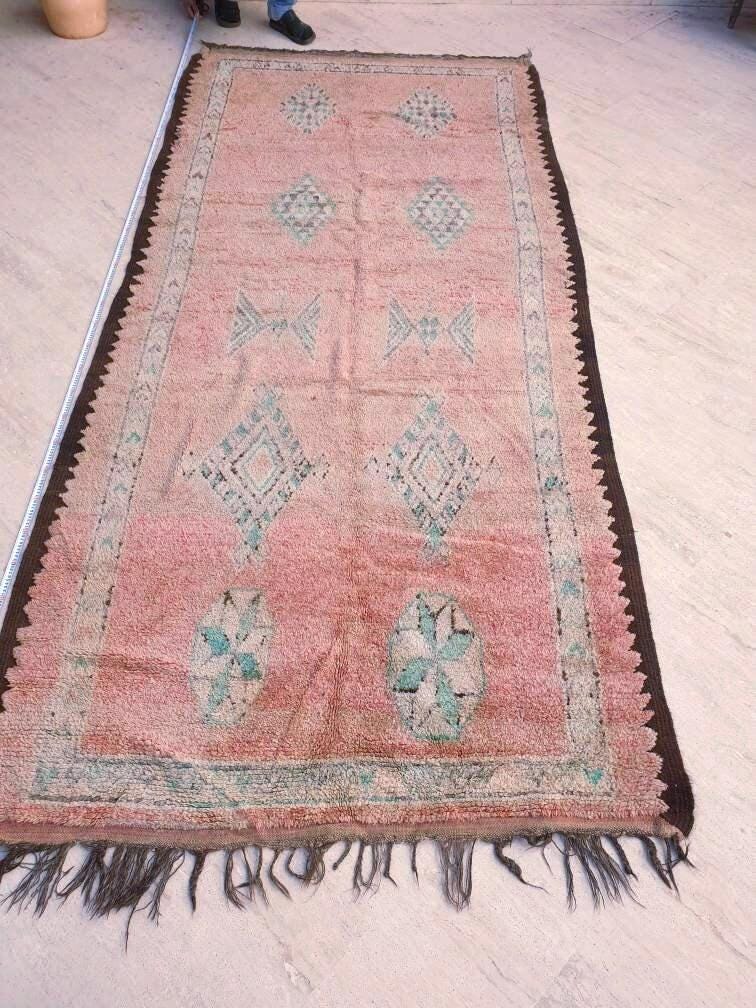 ○ This beauty is subtly wavy in width, which is  the staple of handmade loom woven authentic vintage berber moroccan rugs, and adds to its character that appeals to the Vintage conoisseurs and seekers of the unique berber rugs. Please see photo alligned with measuring tape.