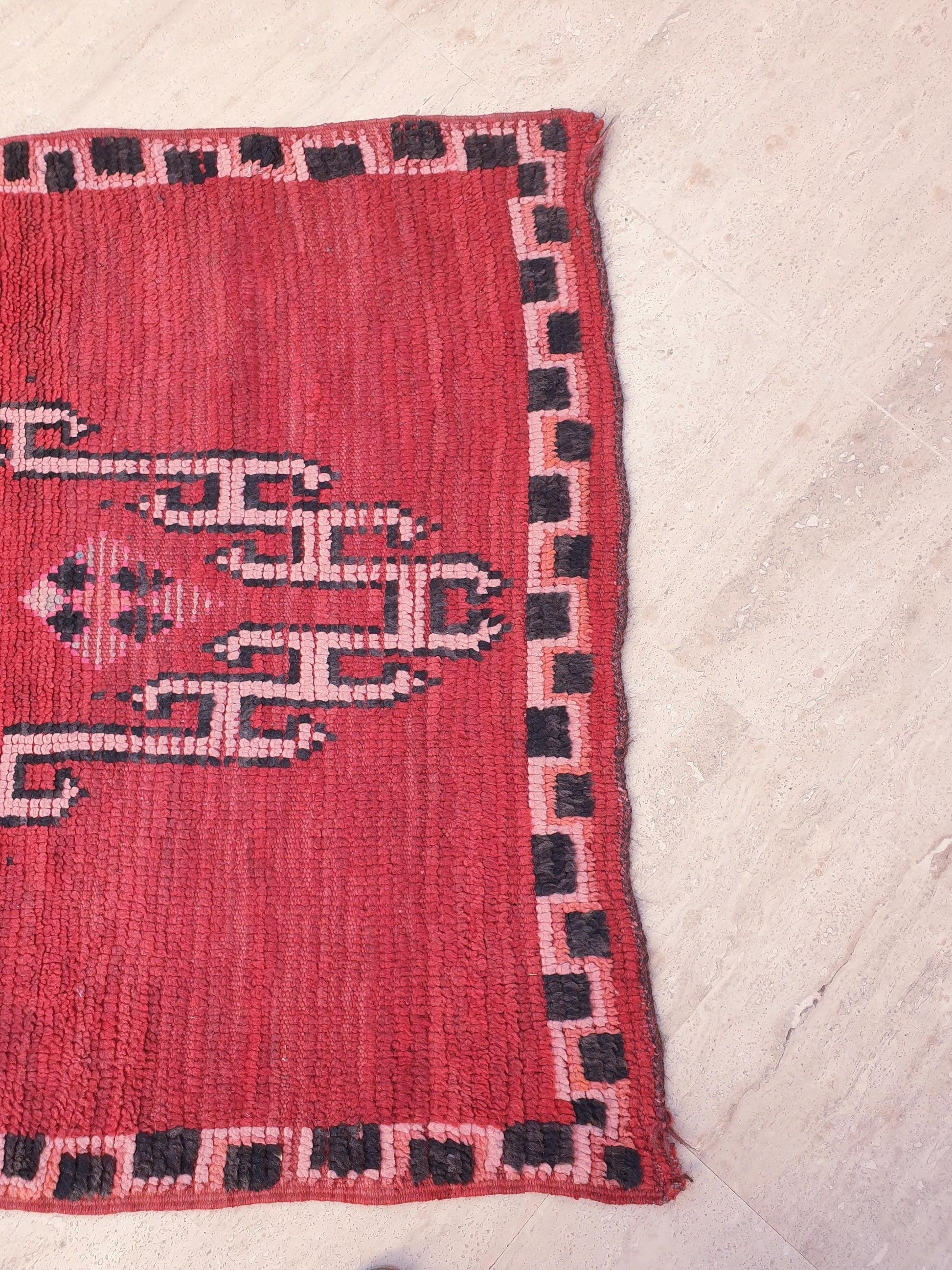 ○ What a gem! Vintage Moroccan  rug. One of a kind antique boujaad rug in nice shades of red and some peach and pink accents. with rich andunique geometric tribal lines and  motifs.  Absolutely unique and beautiful. One of the favorite little rugs I've curated in years.