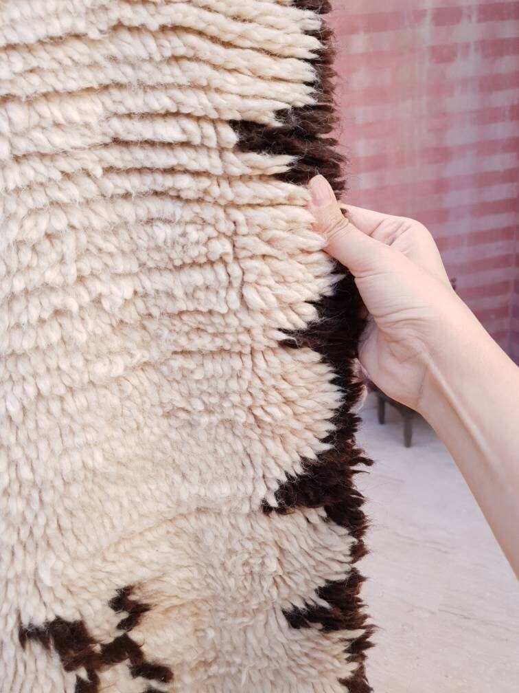 • this beauty has a very subtle repair and which adds to its character.  Natural dark brown wool adorning a warm offwhite light beige natural wool base.
