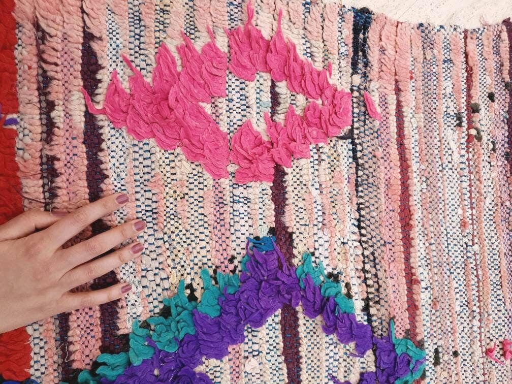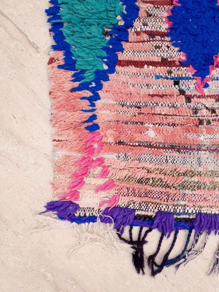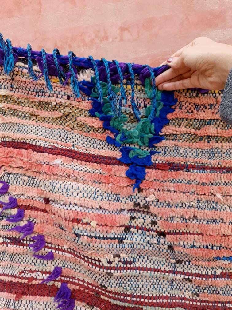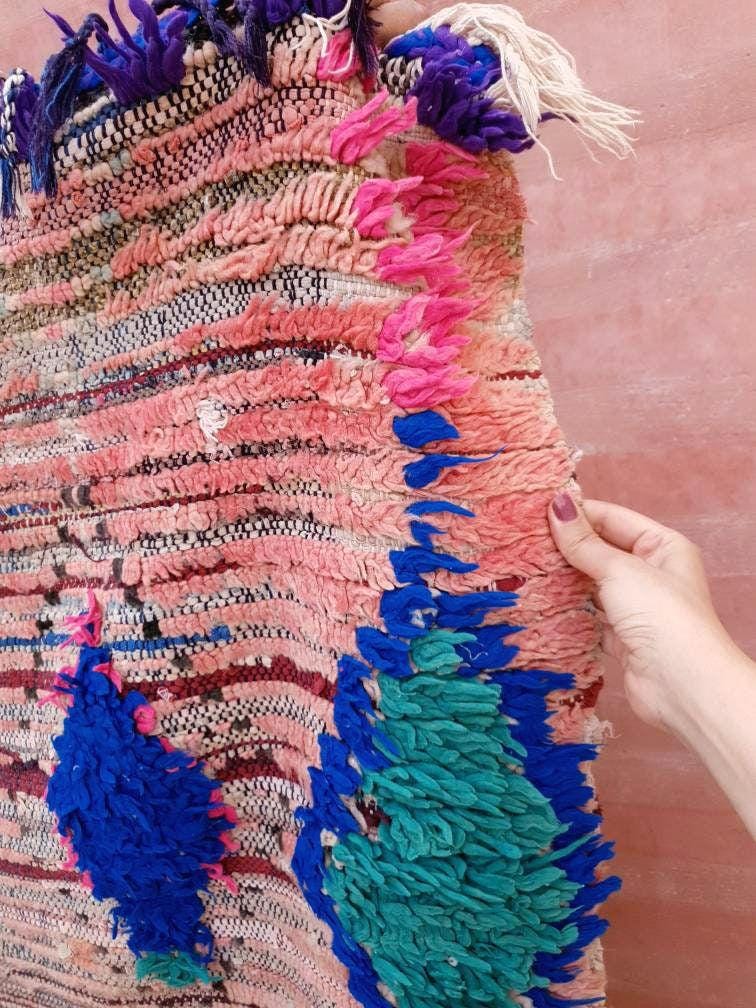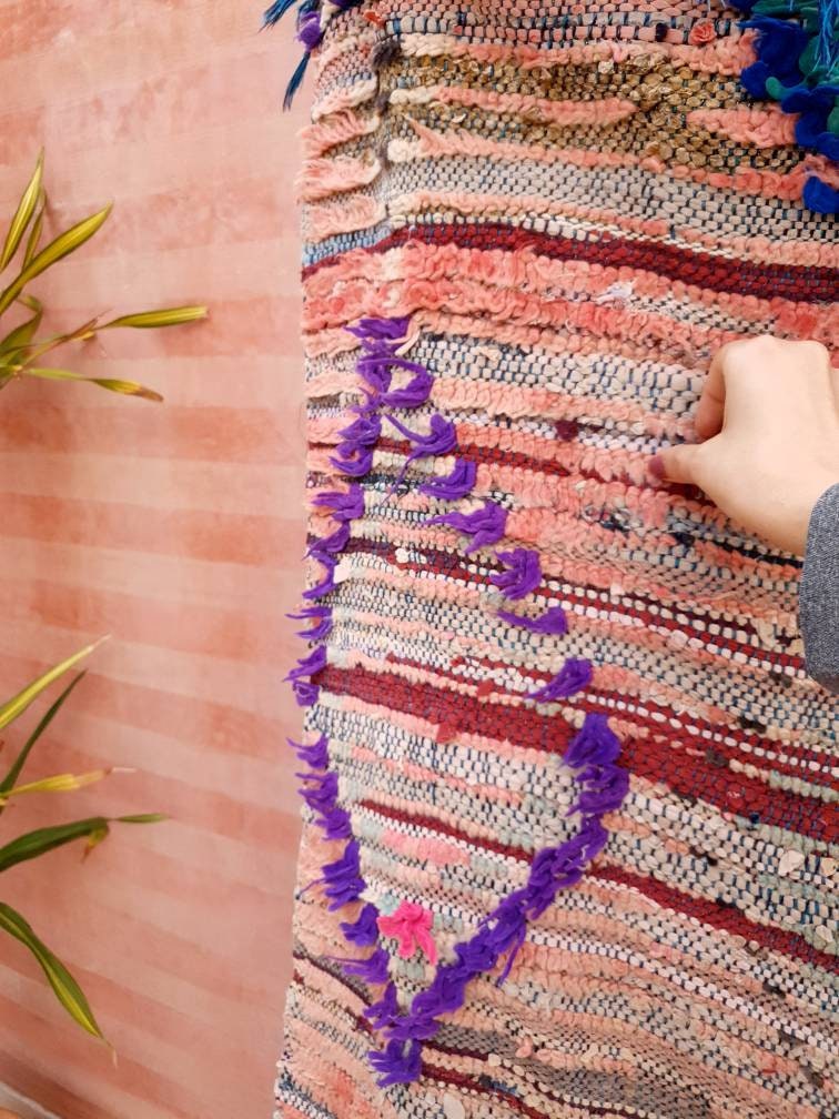 Unique  Gorgeous moroccan  vintage unusual design and color  combination. Blush pink tones, hints of purple teal fushia and blue, and a nicely balance band in red and a nice fringe detail on one side. Head turning piece.