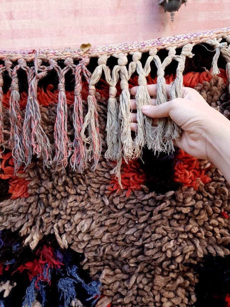 • Authentic vintage boujaad moroccan rug.  Unique and rare design in dark beige brown earthy colored base and beautiful abstract  colors. Haven't seen one like it ever.  sturdy rug with lovely fringe on one side.