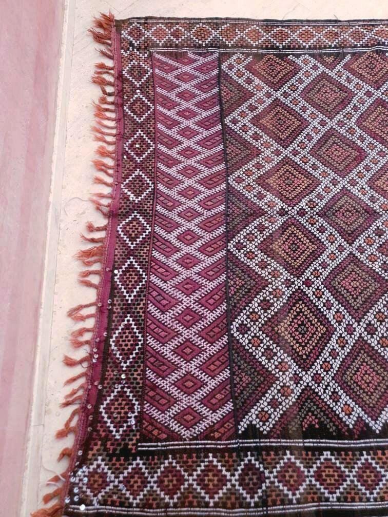 • Not a usual vintage moroccan rug. Moroccan kilim with a few sequins on one end.  See close up photos and marvel!