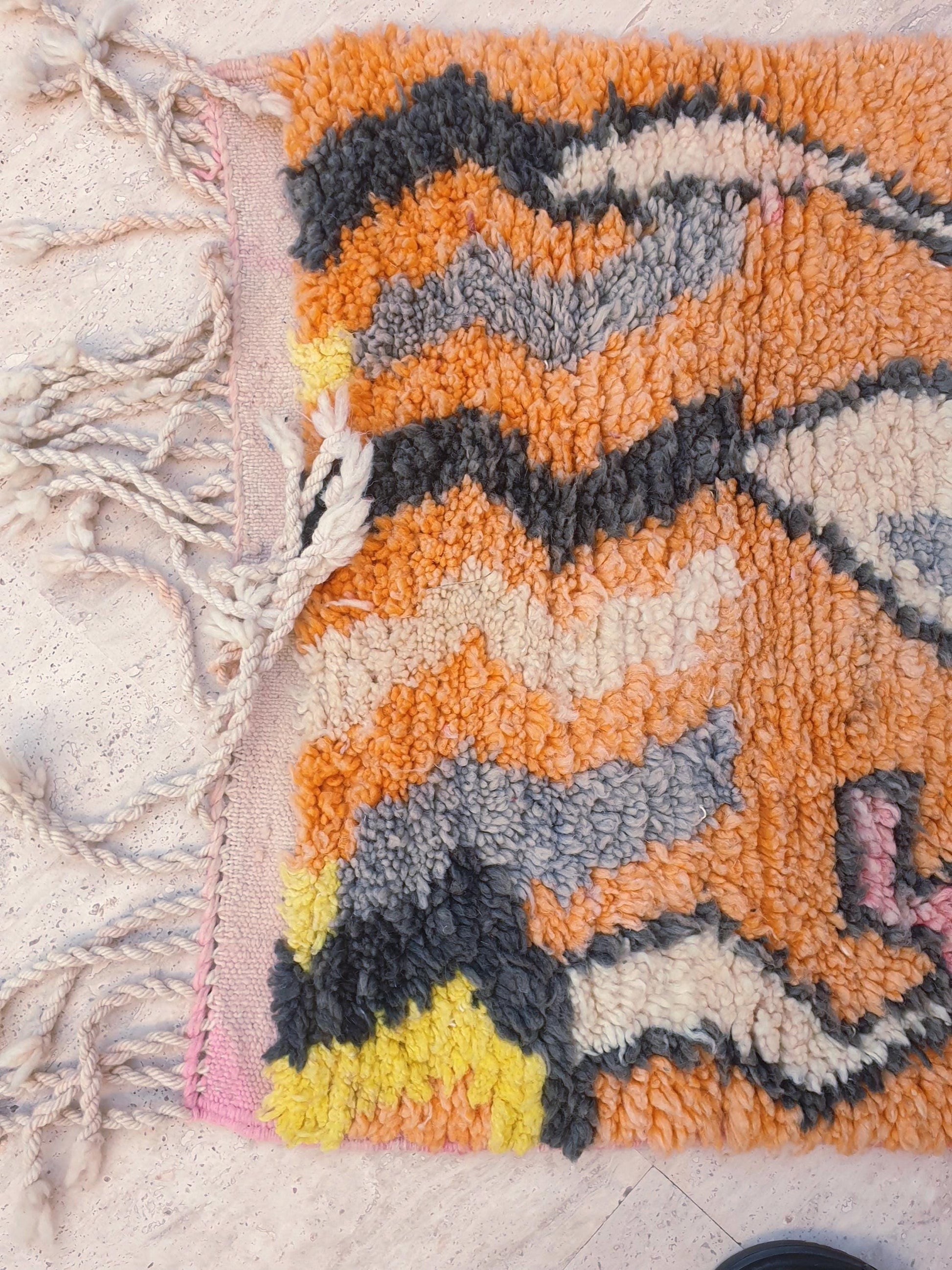 incredibly beautiful and unique colorful abstract wool Moroccan runner rug with a lovely color palette and pattern or coral papaya orange and other.