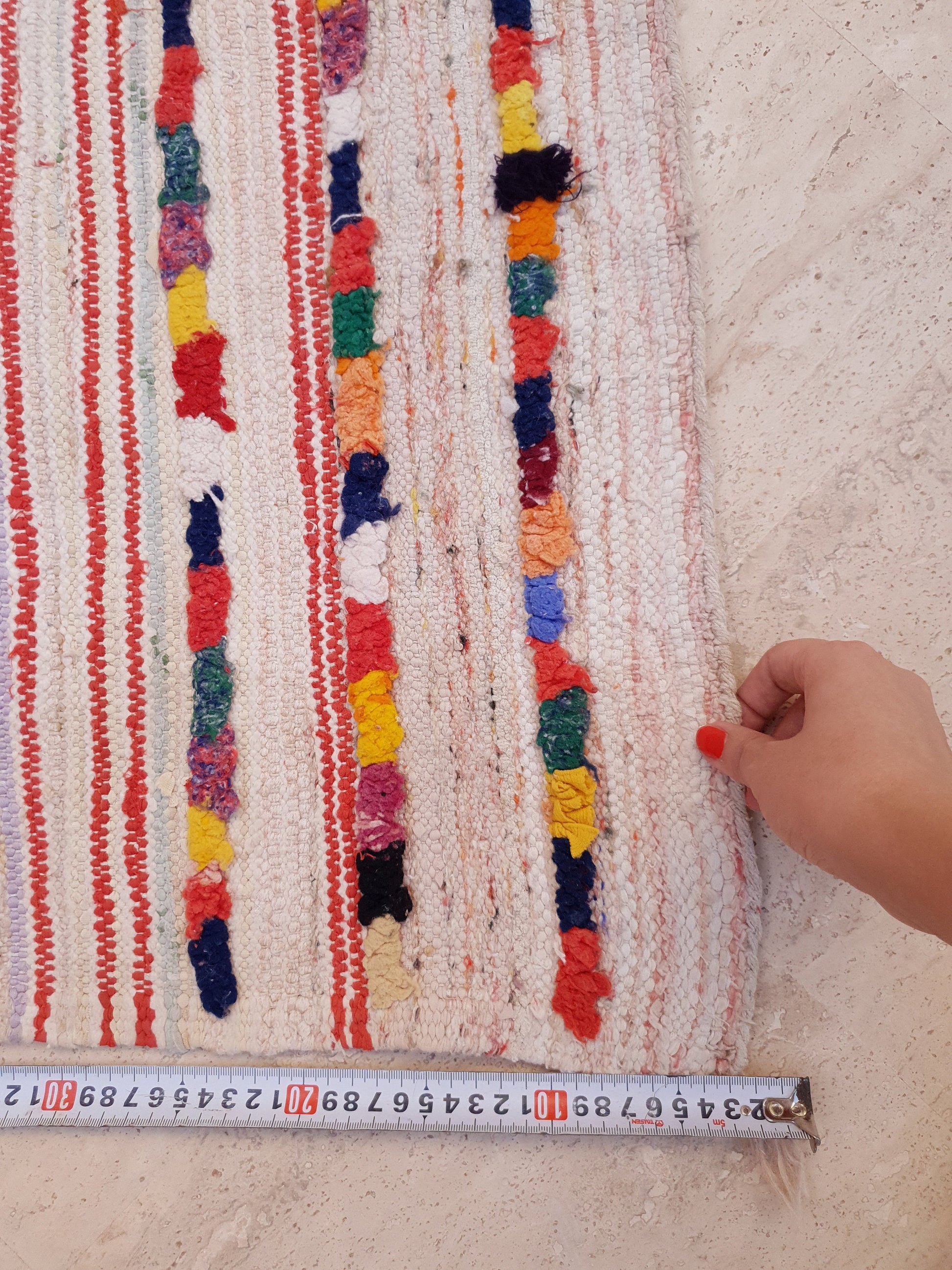 ○ This beauty is subtly wavy in width, which is the staple of handmade loom woven authentic vintage berber moroccan rugs, and adds to its character that appeals to the Vintage conoisseurs and seekers of the unique berber rugs. 👉🏻 Please see photo alligned with measuring tape.