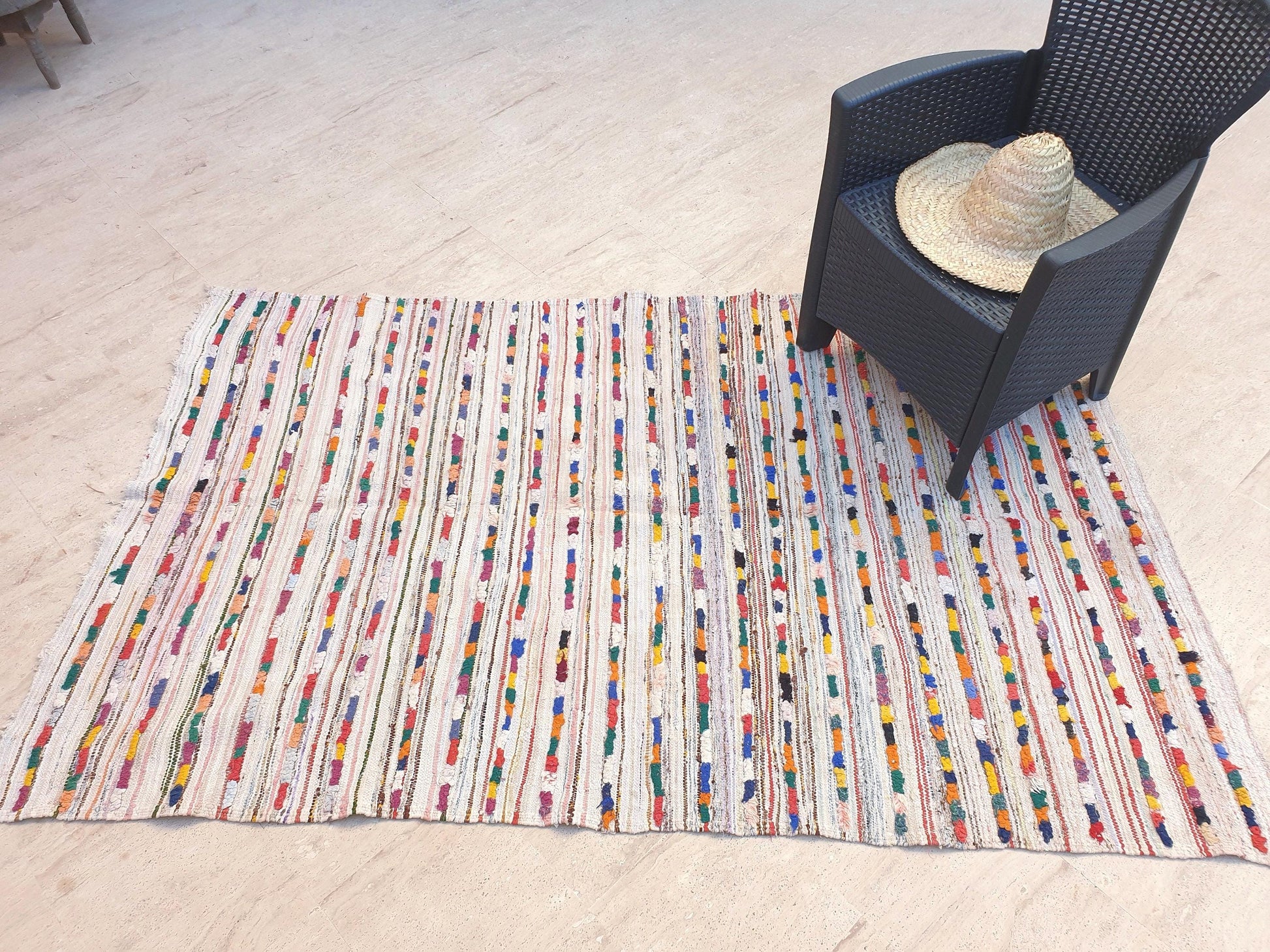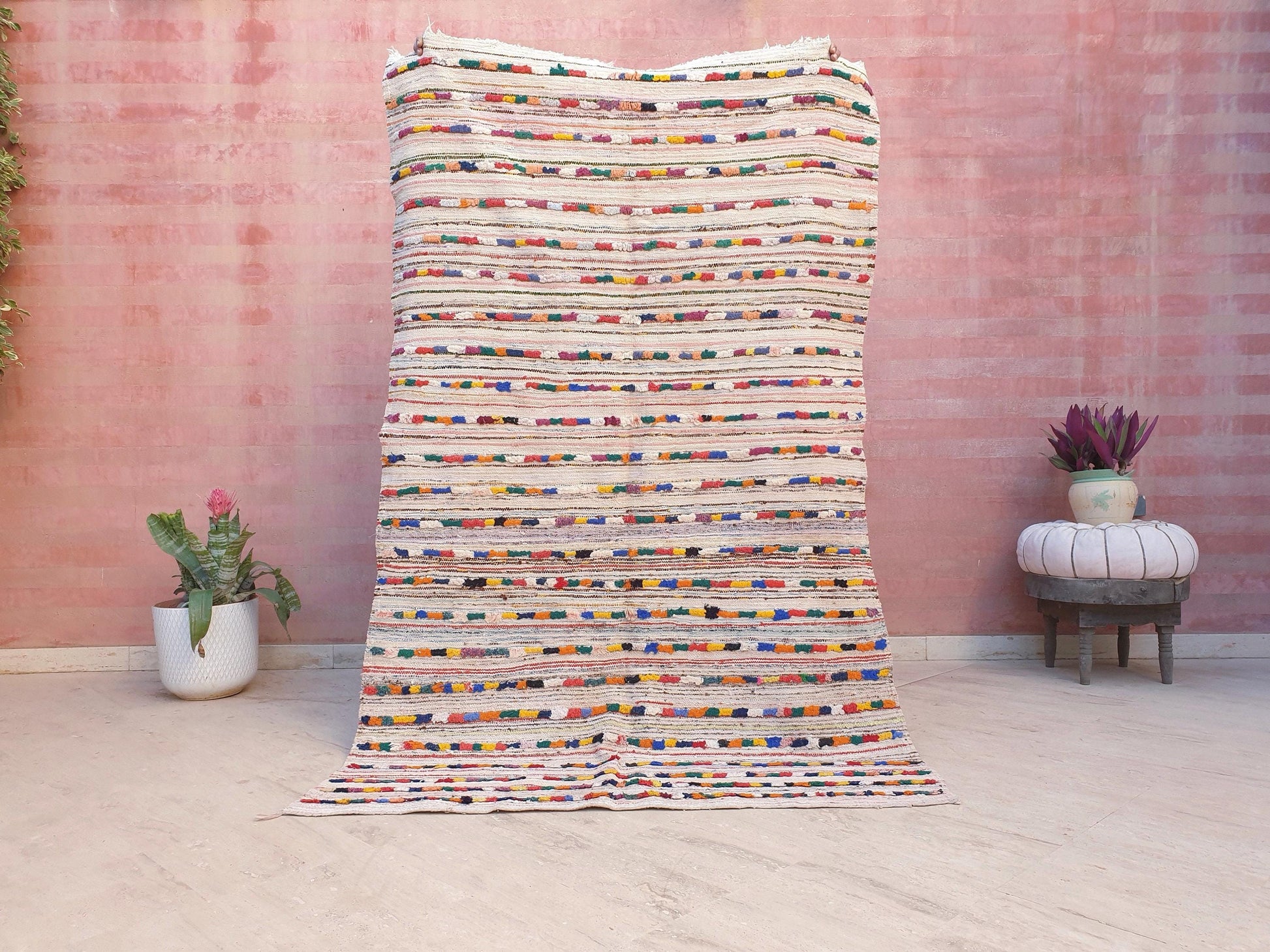 Beautiful vintage moroccan kilim rug 4.3x7 Unique berber offwhite rug, embroidery like woven wool flatwoven rug