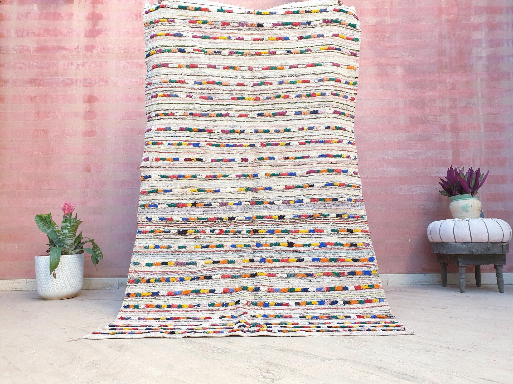 This woven flat kilim has beautiful color pops on a creamy offwhite base and lines of a myriad of soft colors like pink and lavender. inuititve moroccan patterns that look like embroidery. Unique vintage gem.