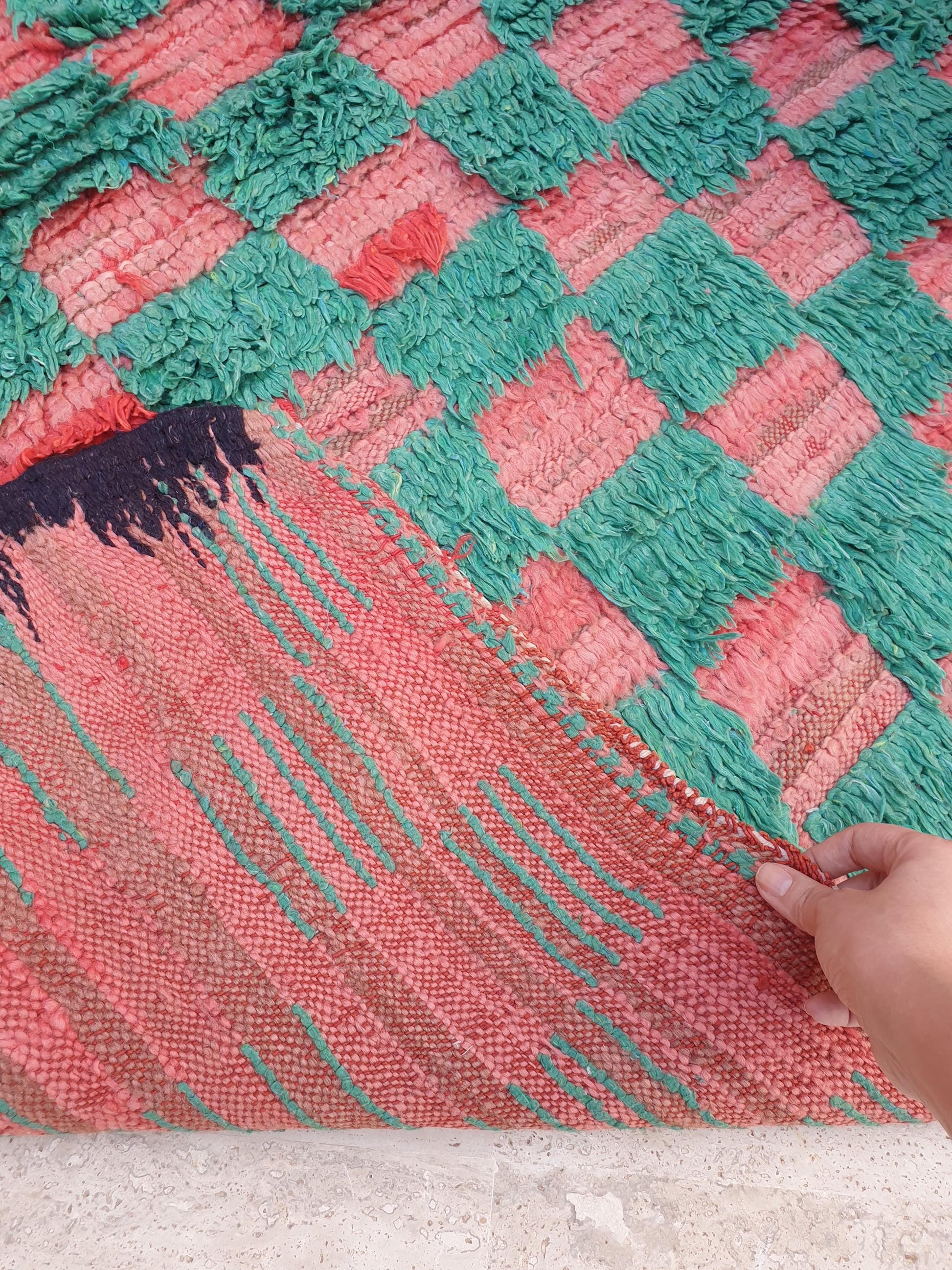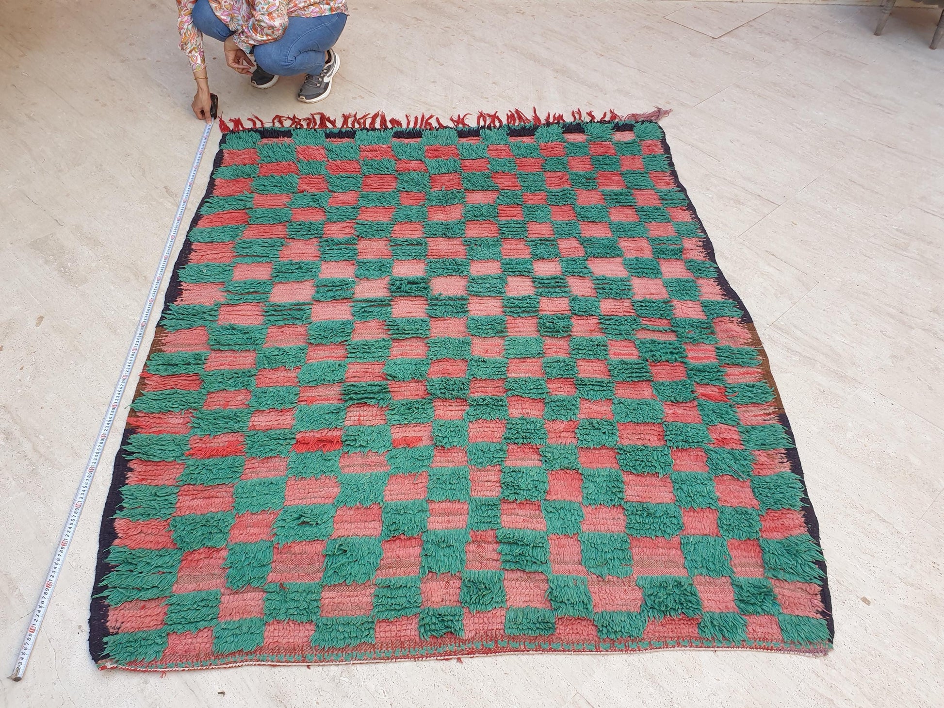 Gorgeous Green Moroccan Rug 5.6x6.9 ft Checkered green pink coral tribal rug, unique boujaad rug, squarish berber rug, salmon handmade rug