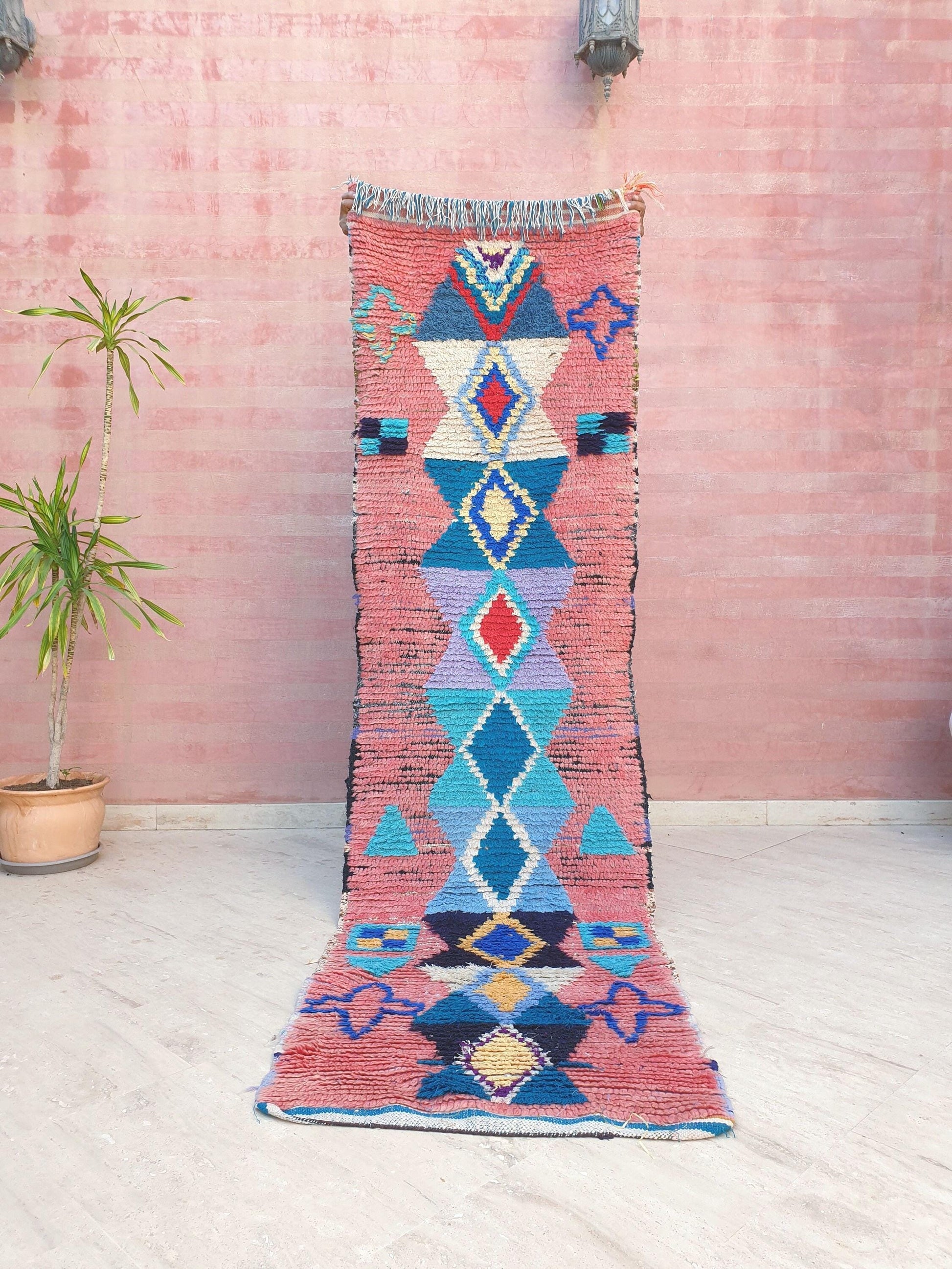 Gorgeous Moroccan rug 2.5x9 "Ibiza" Blue Pink Blue Colorful Runner rug, retro style handmade hallway boujaad rug