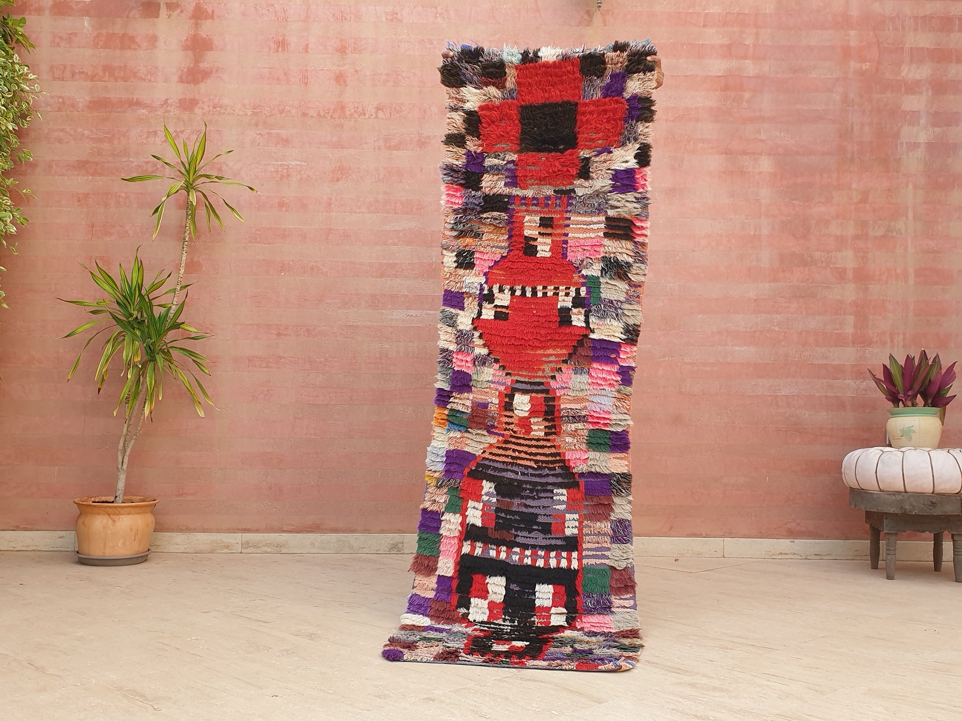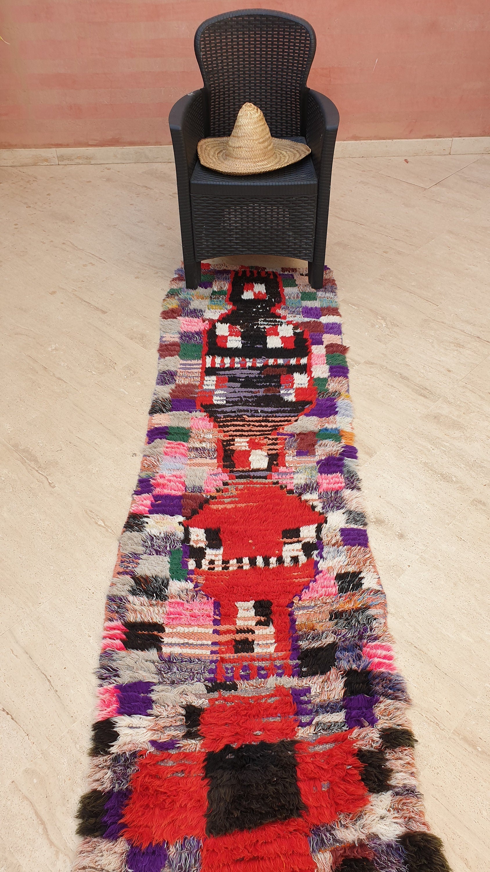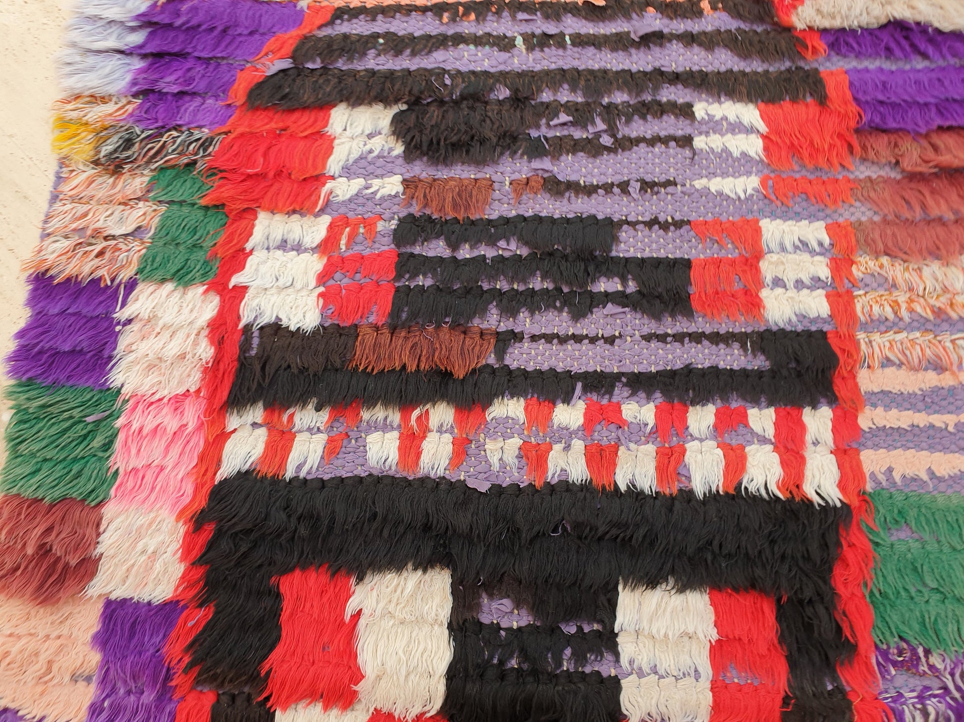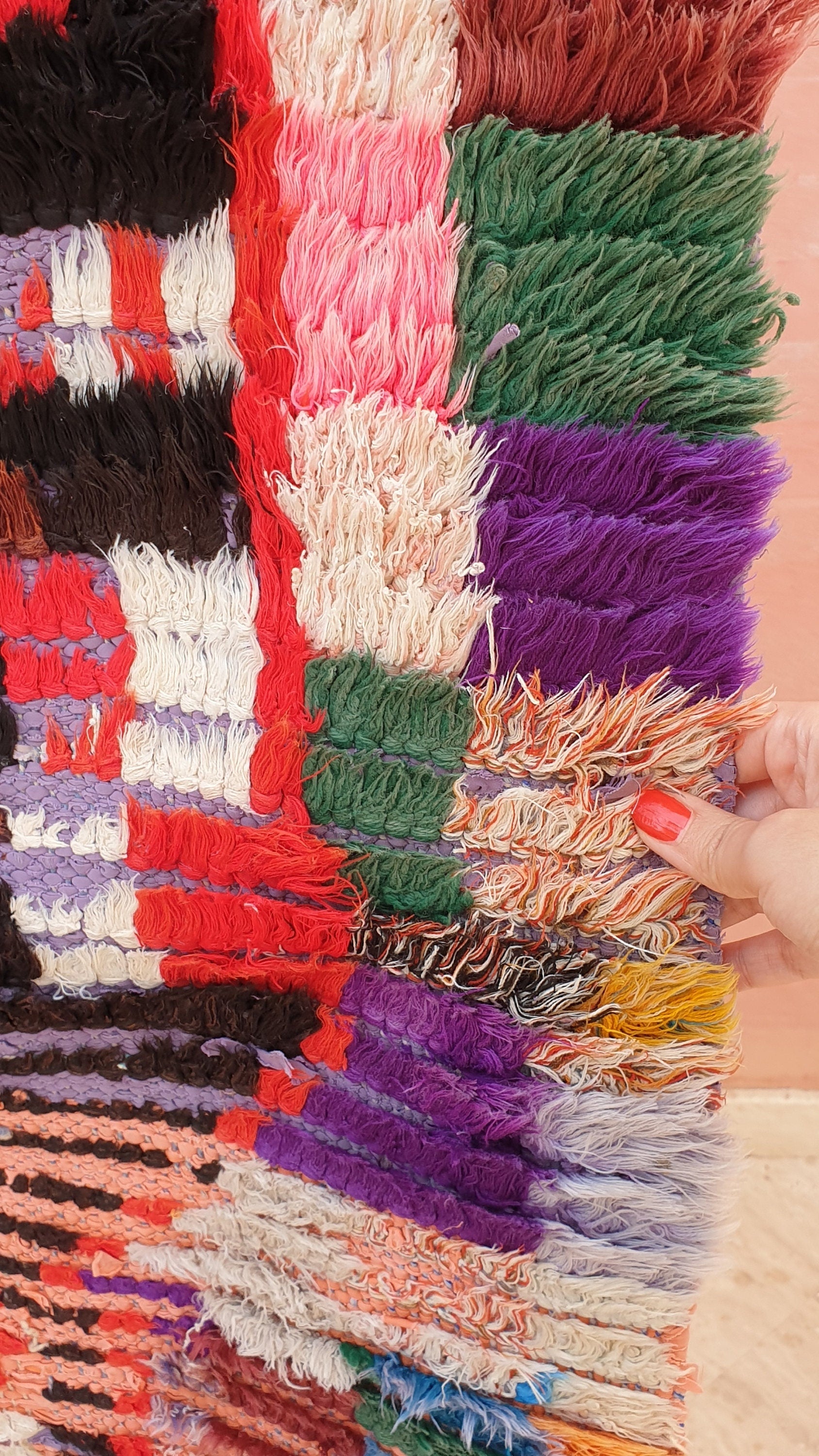 ○ such a gorgeous artistic colorful unique Vintage Moroccan rug. One of a kind abstract vintage mix of wool cotton and boucherouite berber rug. one of a kind vintage gem.