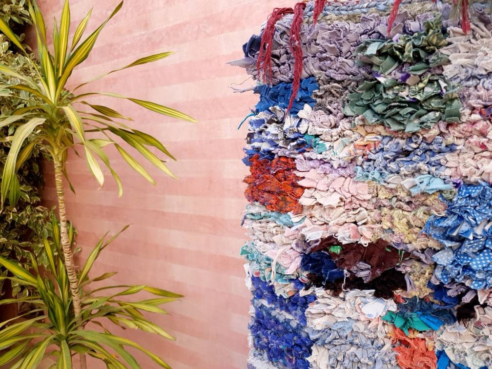 Beautiful vintage rug. Colorful abstract pattern Boucherouite pretty rug. One of a kind intutively woven gem.