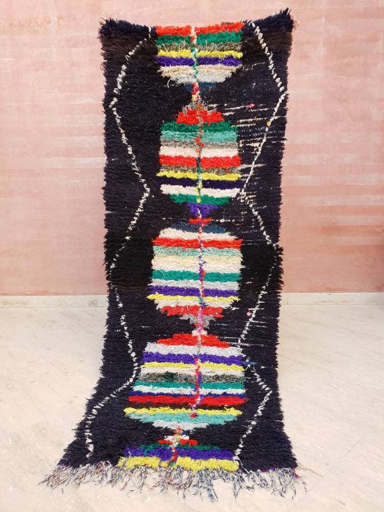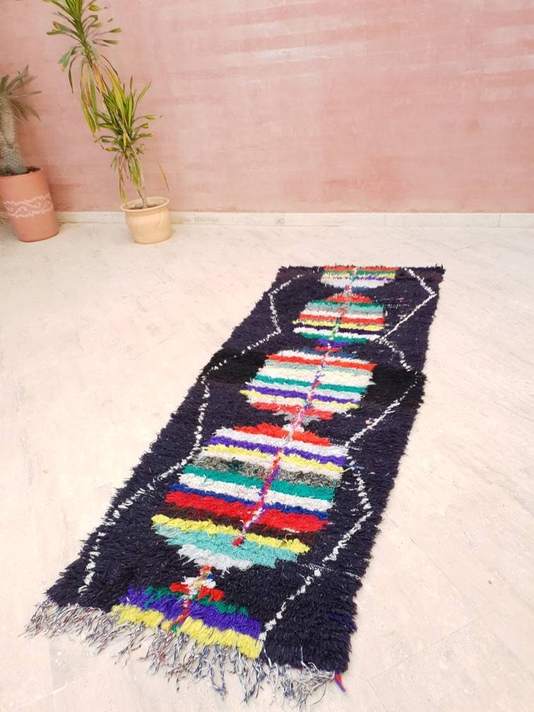 Vintage Moroccan Rug 2.7x7.5 black navy Runner Rug, Azilal rug, Black boucherouite rug, living room rug morrocan bedroom rug, boho rug,