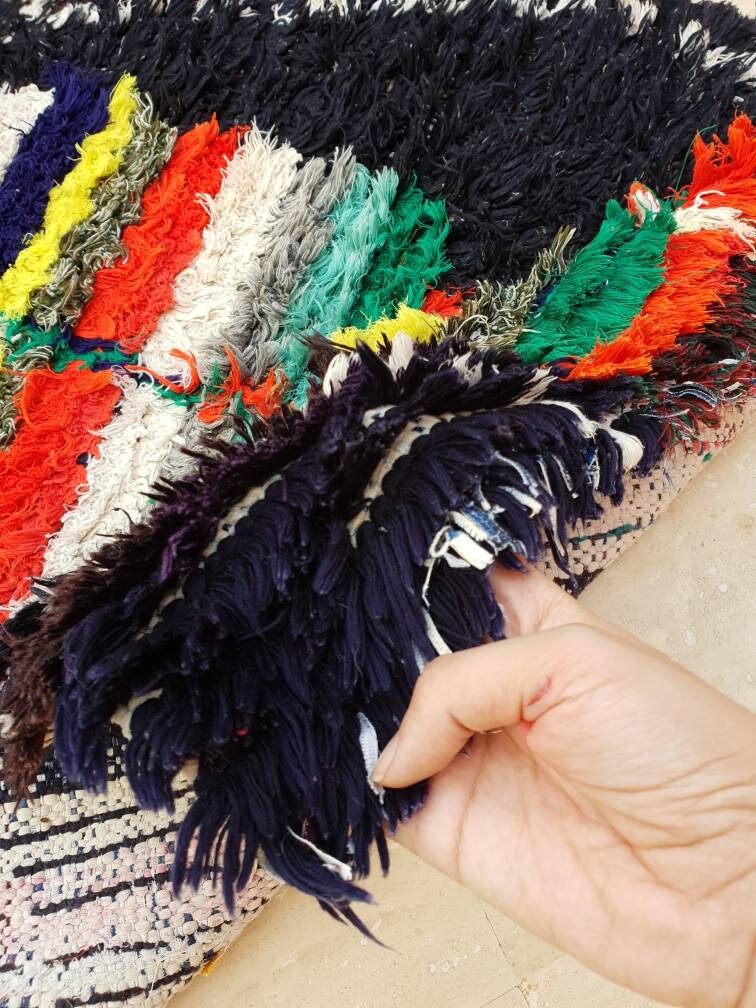 Gorgeous unique vintage rug. Bold piece, rare color. Base is black dark navy blue like and hints of purple and gorgeous colorful design in center. Rare color combination . Unique piece. Authentic Moroccan vintage gem.