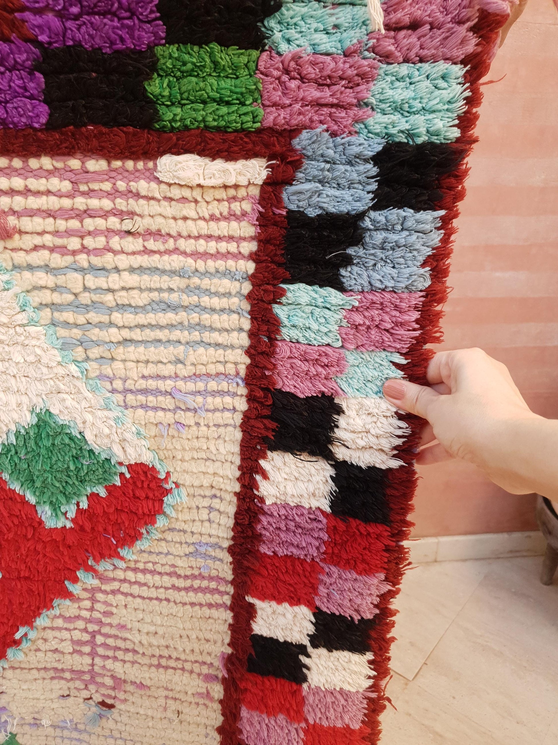 🌿 This beauty is subtly wavy in width, as you can see on the photos, which is the staple of handmade loom woven authentic vintage berber moroccan rugs, and adds to its character that appeals to the Vintage conoisseurs and seekers of the unique berber rugs. Please see photo alligned with measuring tape.