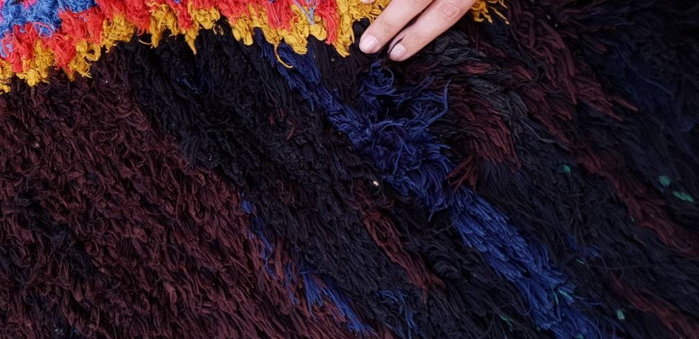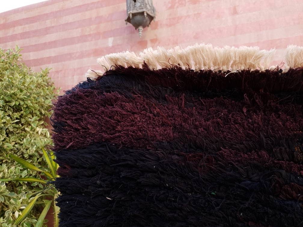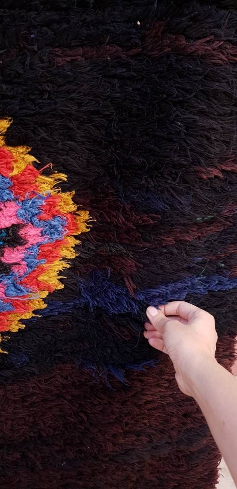 ○ such a Beautiful unique Vintage Moroccan rug. One of a kind dark rug with hints of navy blue which creates reflection effect. And with signature berber moroccan diamond pattern.