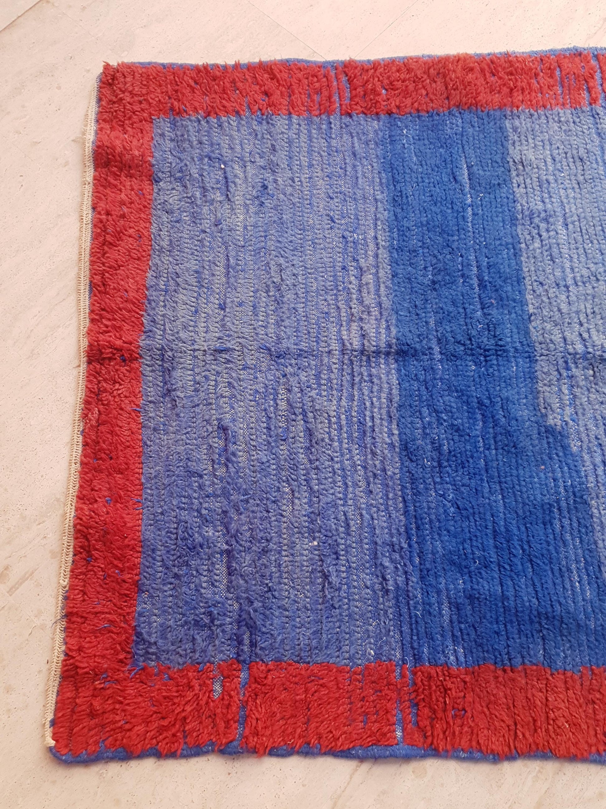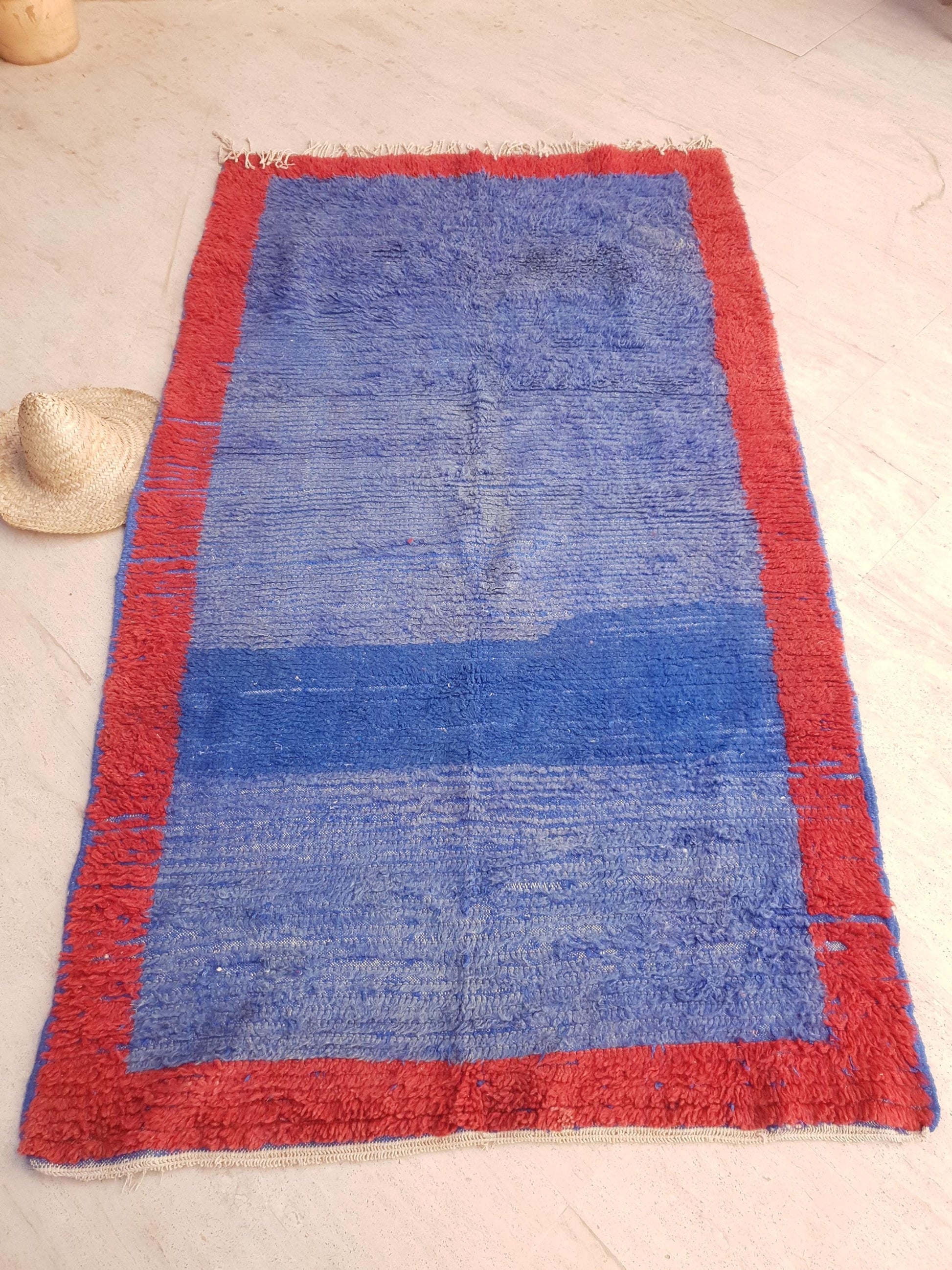 This vintage Boujaad rug from the 1980s radiates quiet confidence. A stunning canvas of layered blues — from denim to indigo — framed by a bold red border that feels almost cinematic. No motifs, no distractions. Just pure texture, deep tones, and minimalist soul. with beautifuk fringe on one side.