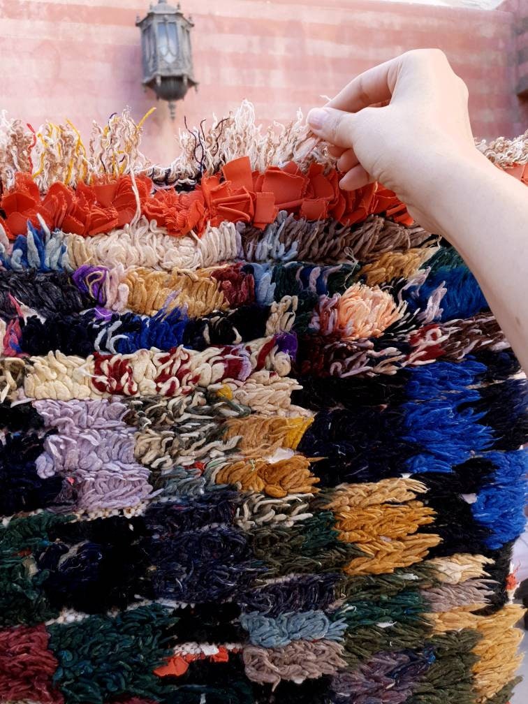 ○ High Atlas boujaad vintage gem. One of a kind warm abstract boucherouite rug with a beautiful color mix and textures. Recycled cotton wool yarn on a wool base.